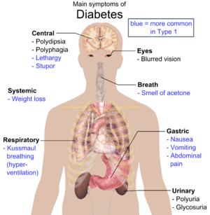 People (usually with type 1 diabetes) may also present with diabetic ketoacidosis, a state of metabolic dysregulation characterized by the smell of acetone, a rapid, deep breathing known as Kussmaul breathing, nausea, vomiting and abdominal pain, and altered states of consciousness.