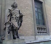 The sculptor Juan Martínez Montañés modeled a statue of one of Velázquez's equestrian portraits of the king, painted in 1636, which was cast in bronze by the Florentine sculptor Pietro Tacca and which now stands in the Plaza de Oriente at Madrid. The original of this portrait no longer exists, but several others do. Velázquez, in this and in all his portraits of the king, depicts Philip wearing the golilla, a stiff linen collar projecting at right angles from the neck. It was invented by the king, who was so proud of it that he celebrated it by a festival followed by a procession to the church to thank God for the blessing. Thus, the golilla was the height of fashion, and appeared in most of the male portraits of the period.