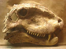 Dimetrodon ( / d aɪ ˈ m ɛ t r ə d ɒ n /; meaning "two measures of teeth") is an extinct genus of synapsid that lived during the Early Permian, around 299–270 million years ago (Ma). It is a member of the family Sphenacodontidae. The most prominent feature of Dimetrodon is the large sail on its back formed by elongated spines extending from the vertebrae. It walked on four legs and had a tall, curved skull with large teeth of different sizes set along the jaws. Most fossils have been found in the southwestern United States, the majority coming from a geological deposit called the Red Beds in Texas and Oklahoma. More recently, fossils have been found in Germany. Over a dozen species have been named since the genus was first described in 1878.