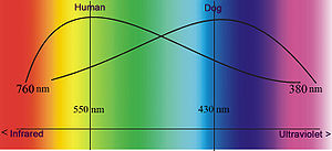 Like most mammals, dogs are dichromats and have colour vision equivalent to red-green colour blindness in humans (deuteranopia). Dogs are less sensitive to differences in grey shades than humans and also can detect brightness at about half the accuracy of humans.