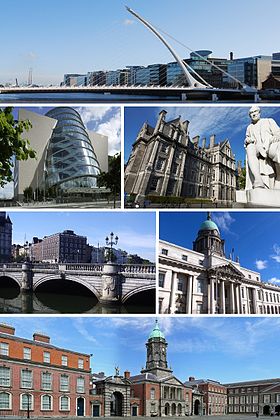 | Clockwise from top: Samuel Beckett Bridge, Trinity College, Custom House, Dublin Castle, O'Connell Bridge, and Convention Centre Dublin. | |||