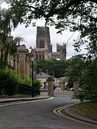 Durham is a hilly city, claiming to be built upon the symbolic seven hills. Upon the most central and prominent position high above the Wear, the cathedral dominates the skyline. The steep riverbanks are densely wooded, adding to the picturesque beauty of the city. West of the city centre, another river, the River Browney, drains south to join the Wear to the south of the city.