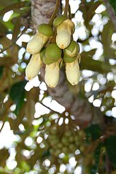 The name durian comes from the Indonesia word duri (thorn) together with the suffix -an (for building a noun in Indonesia). D. zibethinus is the only species commercially cultivated on a large scale and available outside of its native region. Since this species is open-pollinated, it shows considerable diversity in fruit colour and odour, size of flesh and seed, and tree phenology. In the species name, zibethinus refers to the Indian civet, Viverra zibetha. There is disagreement regarding whether this name, bestowed by Linnaeus, refers to civets being so fond of the durian that the fruit was used as bait to entrap them, or to the durian smelling like the civet.