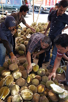 | “ | ... its odour is best described as pig-shit, turpentine and onions, garnished with a gym sock. It can be smelled from yards away. Despite its great local popularity, the raw fruit is forbidden from some establishments such as hotels, subways and airports, including public transportation in Southeast Asia. | ” |