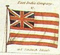 The English East India Company flag changed over time. From the period of 1600 to the 1707 Acts of Union between England and Scotland the flag consisted of a St George's cross in the canton and a number of alternating Red and White stripes. After 1707 the canton contained the original Union Flag consisting of a combined St George's cross and a St Andrew's cross. After the Acts of Union 1800 that joined Ireland with Great Britain to form the United Kingdom, the canton of the East India Company's flag was altered accordingly to include the new Union Flag with the additional Saint Patrick's Flag. There has been much debate and discussion regarding the number of stripes on the flag and the order of the stripes. Historical documents and paintings show many variations from 9 to 13 stripes, with some images showing the top stripe being red and others showing the top stripe being white.