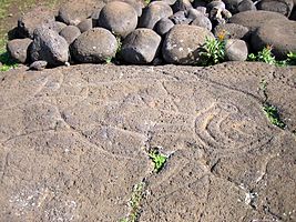 Petroglyphs are pictures carved into rock, and Easter Island has one of the richest collections in all Polynesia. Around 1,000 sites with more than 4,000 petroglyphs are catalogued. Designs and images were carved out of rock for a variety of reasons: to create totems, to mark territory or to memorialize a person or event. There are distinct variations around the island in terms of the frequency of particular themes among petroglyphs, with a concentration of Birdmen at Orongo. Other subjects include sea turtles, Komari (vulvas) and Makemake, the chief god of the Tangata manu or Birdman cult.