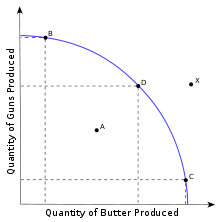 By construction, each point on the curve shows productive efficiency in maximizing output for given total inputs. A point inside the curve (as at A), is feasible but represents production inefficiency (wasteful use of inputs), in that output of one or both goods could increase by moving in a northeast direction to a point on the curve. Examples cited of such inefficiency include high unemployment during a business-cycle recession or economic organization of a country that discourages full use of resources. Being on the curve might still not fully satisfy allocative efficiency (also called Pareto efficiency) if it does not produce a mix of goods that consumers prefer over other points.