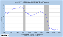 The amount of unemployment in an economy is measured by the unemployment rate, the percentage of workers without jobs in the labour force. The labour force only includes workers actively looking for jobs. People who are retired, pursuing education, or discouraged from seeking work by a lack of job prospects are excluded from the labor force. Unemployment can be generally broken down into several types that are related to different causes. Classical unemployment occurs when wages are too high for employers to be willing to hire more workers. Wages may be too high because of minimum wage laws or union activity. Consistent with classical unemployment, frictional unemployment occurs when appropriate job vacancies exist for a worker, but the length of time needed to search for and find the job leads to a period of unemployment. Structural unemployment covers a variety of possible causes of unemployment including a mismatch between workers' skills and the skills required for open jobs. Large amounts of structural unemployment can occur when an economy is transitioning industries and workers find their previous set of skills are no longer in demand. Structural unemployment is similar to frictional unemployment since both reflect the problem of matching workers with job vacancies, but structural unemployment covers the time needed to acquire new skills not just the short term search process. While some types of unemployment may occur regardless of the condition of the economy, cyclical unemployment occurs when growth stagnates. Okun's law represents the empirical relationship between unemployment and economic growth. The original version of Okun's law states that a 3% increase in output would lead to a 1% decrease in unemployment.