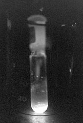 Luminescence of Es3+ ions was however observed in inorganic hydrochloric acid solutions as well as in organic solution with di(2-ethylhexyl)orthophosphoric acid. It shows a broad peak at about 1064 nanometers (half-width about 100 nm) which can be resonantly excited by green light (ca. 495 nm wavelength). The luminescence has a lifetime of several microseconds and the quantum yield below 0.1%. The relatively high, compared to lanthanides, non-radiative decay rates in Es3+ were associated with the stronger interaction of f-electrons with the inner Es3+ electrons.