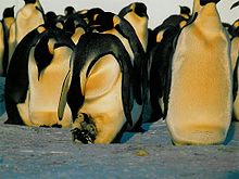 As a defence against the cold, a colony of Emperor Penguins forms a compact huddle (also known as the turtle formation) ranging in size from ten to several hundred birds, with each bird leaning forward on a neighbour. As the Wind chill is the least severe in the centre of the colony, all the juveniles are usually huddled there. Those on the outside upwind tend to shuffle slowly around the edge of the formation and add themselves to its leeward edge, producing a slow churning action, and giving each bird a turn on the inside and on the outside.