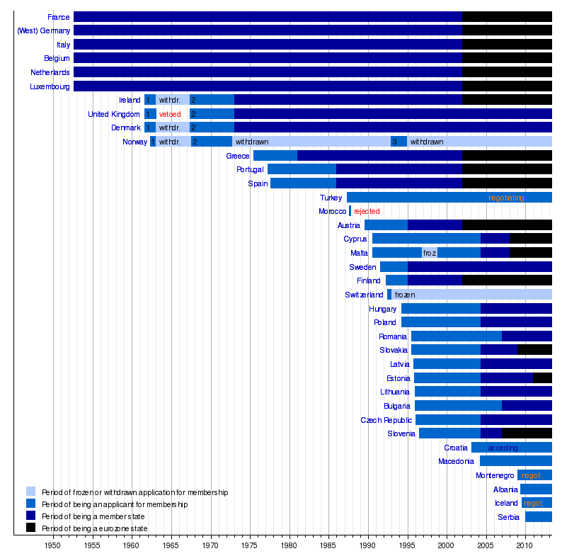 | 5 | Third Enlargement | 1986-01-01 | the above, Spain, Portugal, Azores, Madeira, Plazas de soberanía | the above, with Aruba, formerly part of the Netherlands Antilles | the above, Macao, East Timor |
