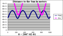 The Eridian orbit is highly eccentric, and brings Eris to within 37.9 AU of the Sun, a typical perihelion for scattered objects. This is within the orbit of Pluto, but still safe from direct interaction with Neptune (29.8–30.4 AU). Pluto, on the other hand, like other plutinos, follows a less inclined and less eccentric orbit and, protected by orbital resonance, can cross Neptune's orbit. It is possible that Eris is in a 17:5 resonance with Neptune, though further observations will be required to check that hypothesis. Unlike the eight planets, whose orbits all lie roughly in the same plane as the Earth's, Eris's orbit is highly inclined: It is tilted at an angle of about 44 degrees to the ecliptic. In about 800 years, Eris will be closer to the Sun than Pluto for some time (see the graph at the right).
