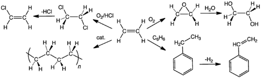 The π-bond in the ethylene molecule is responsible for its useful reactivity. The double bond is a region of high electron density, thus it is susceptible to attack by electrophiles. Many reactions of ethylene are catalyzed by transition metals, which bind transiently to the ethylene using both the π and π* orbitals.