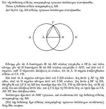 In the 19th century, it was realized that Euclid's ten axioms and common notions do not suffice to prove all of theorems stated in the Elements. For example, Euclid assumed implicitly that any line contains at least two points, but this assumption cannot be proved from the other axioms, and therefore needs to be an axiom itself. The very first geometric proof in the Elements, shown in the figure on the right, is that any line segment is part of a triangle; Euclid constructs this in the usual way, by drawing circles around both endpoints and taking their intersection as the third vertex. His axioms, however, do not guarantee that the circles actually intersect, because they are consistent with discrete, rather than continuous, space. Starting with Moritz Pasch in 1882, many improved axiomatic systems for geometry have been proposed, the best known being those of Hilbert, George Birkhoff, and Tarski.
