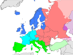 Key: blue: states which straddle the border between Europe and Asia; green: states not geographically in Europe, but closely associated politically