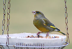 The European Greenfinch, or just Greenfinch, Carduelis chloris, is a small passerine bird in the finch family Fringillidae. The genus Carduelis might be split up and in this case, the greenfinches would be separated in their old genus Chloris again.
