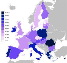 In 2010, 47.3 million people lived in the EU, who were born outside their resident country. This corresponds to 9.4% of the total EU population. Of these, 31.4 million (6.3%) were born outside the EU and 16.0 million (3.2%) were born in another EU member state. The largest absolute numbers of people born outside the EU were in Germany (6.4 million), France (5.1 million), the United Kingdom (4.7 million), Spain (4.1 million), Italy (3.2 million), and the Netherlands (1.4 million).