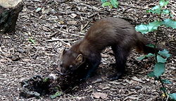 Their habitats are usually well-wooded areas. Pine Martens usually make their own dens in hollow trees or scrub-covered fields. Martens are the only mustelids with semi-retractable claws. This enables them to lead more arboreal lifestyles, such as climbing or running on tree branches, although they are also relatively quick runners on the ground. They are mainly active at night and dusk. They have small rounded, highly sensitive ears and sharp teeth for eating small mammals, birds, insects, frogs, and carrion. They have also been known to eat berries, bird's eggs, and honey. Pine Martens are territorial animals, they mark their range by depositing faeces in prominent locations.