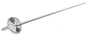- Épée — a heavy thrusting weapon; the valid target area covers the entire body; double touches are allowed.