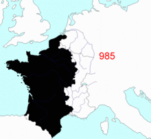 The Carolingian dynasty ruled France until 987, when Hugh Capet, Duke of France and Count of Paris, was crowned King of the Franks. His descendants – the Capetians, the House of Valois, and the House of Bourbon – progressively unified the country through wars and dynastic inheritance into the Kingdom of France, which was fully declared in 1190 by Philip II Augustus. French knights took an active part in many of the Crusades that were fought between 1095 and 1291 to restore Christian control over the Holy Land. Crusaders were so predominately French that the word "crusader" in the Arabic language is simply known as Al-Franj or "The Franks" and Old French became the lingua franca of the Kingdom of Jerusalem.