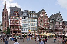 | Skyline of Frankfurt am Main, Clockwise from top of left to right: Facade of the Römer and Frankfurt Cathedral, Statue of Charlemagne in Frankfurt Historical Museum, View of Frankfurt skyline and Main River | ||
