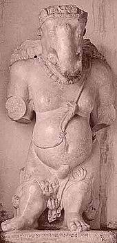 Ganesha images were prevalent in many parts of India by the 6th century. The figure shown to the right is typical of Ganesha statuary from 900–1200, after Ganesha had been well-established as an independent deity with his own sect. This example features some of Ganesha's common iconographic elements. A virtually identical statue has been dated between 973–1200 by Paul Martin-Dubost, and another similar statue is dated c. 12th century by Pratapaditya Pal. Ganesha has the head of an elephant and a big belly. This statue has four arms, which is common in depictions of Ganesha. He holds his own broken tusk in his lower-right hand and holds a delicacy, which he samples with his trunk, in his lower-left hand. The motif of Ganesha turning his trunk sharply to his left to taste a sweet in his lower-left hand is a particularly archaic feature. A more primitive statue in one of the Ellora Caves with this general form has been dated to the 7th century. Details of the other hands are difficult to make out on the statue shown. In the standard configuration, Ganesha typically holds an axe or a goad in one upper arm and a noose in the other upper arm.