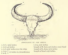The cow is considerably lighter in make and in colour than the bull. The horns are more slender and upright, with more inward curvature, and the frontal ridge is scarcely perceptible. In young animals the horns are smooth and polished. In old bulls they are rugged and dented at the base.