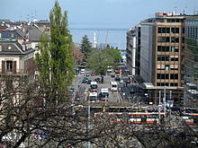 | Top left: Palace of Nations, Middle left: ATLAS experiment at CERN, Right: Jet d'Eau, Bottom: View over Geneva and the lake. | ||||||||||