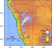 Terrain: Mostly high plateau; Namib Desert along coast; Kalahari Desert in east. In the north near the border with Angola there is a flat area that has been designated by the World Wildlife Fund as part of the Angolan Mopane woodlands ecoregion.