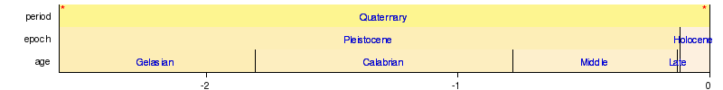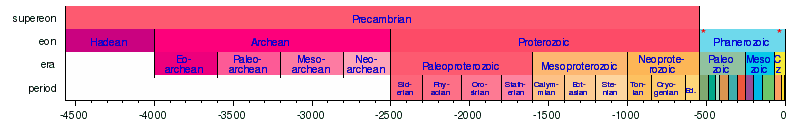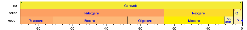 The following four timelines show the geologic time scale. The first shows the entire time from the formation of the Earth to the present, but this compresses the most recent eon. Therefore the second scale shows the most recent eon with an expanded scale. Finally, the second scale again compresses the most recent era, so the latest era is expanded in the third scale. Since the Quaternary is a very short period with short epochs, it is expanded in the fourth scale. The second, third, and fourth timelines are therefore each subsections of their preceding timeline as indicated by asterisks. The Holocene (the latest epoch) is too small to be shown clearly on the third timeline, another reason for expanding the fourth scale.