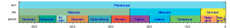 - 542± 0.3 Ma: Cambrian explosion – vast multiplication of hard-bodied life; first abundant fossils; start of the Paleozoic