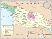 Georgia proper shown in dark green; areas outside of Georgian control shown in light green.