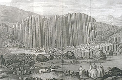 The "discovery" of the Giant's Causeway was announced to the world in 1693 by the presentation of a paper to the Royal Society from Sir Richard Bulkeley, a fellow of Trinity College, Dublin, although the "discoverer" had, in fact, been the Bishop of Derry who had visited the site a year earlier. The site received international attention when Dublin artist Susanna Drury made watercolour paintings of it in 1739; they won Drury the first award presented by the Royal Dublin Society in 1740 and were engraved in 1743.In 1765 an entry on the Causeway appeared in volume 12 of the French Encyclopédie, which was informed by the engravings of Drury's work; the engraving of the "East Prospect" itself appeared in a 1768 volume of plates published for the Encyclopédie. In the caption to the plates French geologist Nicolas Desmarest suggested, for the first time in print, that such structures were volcanic in origin.