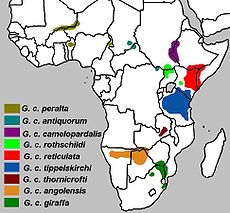 - Kordofan Giraffe (G.c. antiquorum) — smaller, more irregular spots that cover the inner legs. Range: western and southwestern Sudan.