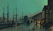 In its subsequent industrial era, Glasgow produced textiles, chemicals, engineered goods and steel, which were exported. The opening of the Monkland Canal and basin at Port Dundas in 1795, facilitated access to the iron-ore and coal mines in Lanarkshire. After extensive River engineering projects to dredge and deepen the River Clyde as far as Glasgow, shipbuilding became a major industry on the upper stretches of the river, building many famous ships (although many were actually built in Clydebank). The River Clyde then became an important source of inspiration for artists, such as John Atkinson Grimshaw, willing to depict the new industrial era and the modern world. Glasgow's population had surpassed that of Edinburgh by 1821. By the end of the 19th century the city was known as the " Second City of the Empire" and by 1870 was producing more than half Britain's tonnage of shipping and a quarter of all locomotives in the world. During this period, the construction of many of the city's greatest architectural masterpieces and most ambitious civil engineering projects, such as the Loch Katrine aqueduct, Subway, Tramway system, City Chambers, Mitchell Library and Kelvingrove Art Gallery and Museum were being funded by its wealth. The city also held a series of International Exhibitions at Kelvingrove Park, in 1888, 1901 and 1911, with the Empire Exhibition subsequently held in 1938.