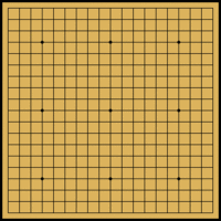 ![]() Go is played on a grid of black lines (usually 19×19). Game pieces, called stones, are played on the line intersections. |