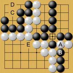 Players are not allowed to make a move that returns the game to the previous position. This rule, called the ko rule (Chinese: 劫; Japanese: 劫 kō "eon", Korean: 패; 'pae'), prevents unending repetition. As shown in the example pictured to the right: Black has just played the stone marked 1, capturing a white stone at the intersection marked with a circle. If White were now allowed to play on the marked intersection, that move would capture the black stone marked 1 and recreate the situation before Black made the move marked 1. Allowing this could result in an unending cycle of captures by both players. The ko rule therefore prohibits White from playing at the marked intersection immediately. Instead White must play elsewhere; Black can then end the ko by filling at the marked intersection, creating a five-stone black chain. If White wants to continue the ko (that specific repeating position), White tries to find a play elsewhere on the board that Black must answer; if Black answers, then White can retake the ko. A repetition of such exchanges is called a ko fight.