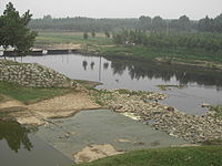 This ‘Inner Canal’ runs between the Yangtze and Huai'an in Jiangsu, skirting the Shaobo, Gaoyou and Hongze lakes of central Jiangsu. Here the land lying to the west of the canal is higher than its bed while the land to the east is lower. Traditionally the Shanghe region west of the canal has been prone to frequent flooding, while the Xiahe region to its east has been hit by less frequent but immensely damaging inundations caused by failure of the Grand Canal levees. Recent works have allowed floodwaters from Shanghe to be safely diverted out to sea.
