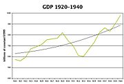 In 1929, federal expenditures constituted only 3% of the GDP. Between 1933 and 1939, they tripled, funded primarily by a growth in the national debt. The debt as proportion of GNP rose under Hoover from 20% to 40%. Roosevelt kept it at 40% until the war began, when it soared to 128%. After the Recession of 1937, conservatives were able to form a bipartisan conservative coalition to stop further expansion of the New Deal and, by 1943, had abolished all of the relief programs.