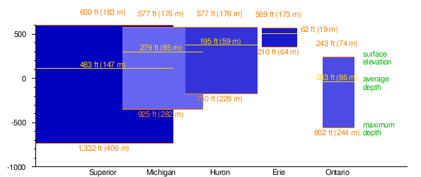 Relative elevations, average depths, maximum depths, and volumes of the Great Lakes.