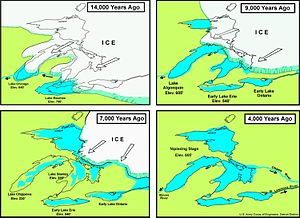 The Great Lakes were formed at the end of the last ice age about 10,000 years ago, when the Laurentide ice sheet receded. When this happened, the glaciers left behind a large amount of meltwater (see Lake Agassiz) which filled up the basins that the glaciers had carved, thus creating the Great Lakes as we know them today. Because of the uneven nature of glacier erosion, some higher hills became Great Lakes islands. The Niagara Escarpment follows the contour of the Great Lakes between New York and Wisconsin.
