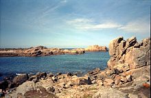 At 49°28′N 2°35′W, Alderney, Guernsey, Herm, Sark, and some other smaller islands have a total area of 78 square kilometres (30 sq mi) and a coastline of about 50 kilometres (31 mi). By itself, the island of Guernsey has a total area of 63.4 square kilometres (24.5 sq mi). Guernsey is situated 50 kilometres (31 mi) west of France's Normandy coast and 120 kilometres (75 mi) south of Weymouth, England and lies in the Gulf of St Malo. Lihou, a tidal island, is attached to Guernsey by a causeway at low tide. The terrain is mostly level with low hills in southwest. The southeastern point is Jerbourg Point, used by the Germans during World War II. Elevation varies across the bailiwick from sea level to 114 m (374 ft) at Le Moulin on Sark. The highest point in mainland Guernsey is Hautnez (111 m (364 ft)), in Alderney at Le Rond But (101 m (331 ft)), in Jethou (76 m (249 ft)) and Herm (98 m (322 ft)). Natural resources include cropland.