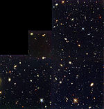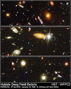 The Hubble Deep Field (HDF) is an image of a small region in the constellation Ursa Major, based on the results of a series of observations by the Hubble Space Telescope. It covers an area 15 arcminutes across, equivalent in angular size to a tennis ball (about 65mm) at a distance of 100 metres and a two-millionth of our sky. The image was assembled from 342 separate exposures taken with the Space Telescope's Wide Field and Planetary Camera 2 over ten consecutive days between December 18 and December 28, 1995.