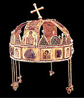 The year 972 marked the date when the ruling prince ( Hungarian: fejedelem) Géza of the Árpád dynasty officially started to integrate Hungary into the Christian Western Europe. His first-born son, Saint Stephen I became the first King of Hungary after defeating his pagan uncle Koppány, who also claimed the throne. Under Stephen, Hungary was recognized as a Catholic Apostolic Kingdom. Applying to Pope Sylvester II, Stephen received the insignia of royalty (including probably a part of the Holy Crown of Hungary, currently kept in the Hungarian Parliament) from the papacy.