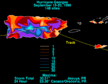 Hurricane Georges (pron.: / ˈ ʒ ɔr ʒ /) was a powerful and long-lived Cape Verde-type Category 4 hurricane which caused severe destruction as it traversed the Caribbean and Gulf of Mexico in September 1998, making seven landfalls along its path. Georges was the seventh tropical storm, fourth hurricane, and second major hurricane of the 1998 Atlantic hurricane season. It became the second most destructive storm of the season after Hurricane Mitch and the costliest Atlantic hurricane since Hurricane Andrew in 1992. Georges killed 604 people, mainly on the island of Hispaniola, and caused extensive damage resulting at nearly $6 billion (1998 US dollars, $8.45 billion 2013 USD) in damages mostly in St. Kitts and Nevis, Puerto Rico and Hispaniola.