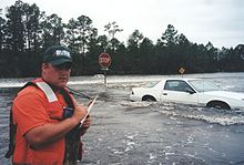 Upon making landfall, Hurricane Georges produced a storm surge of up to 10 feet (3 m) in the Florida Panhandle, with higher waves on top of it. As it moved slowly through the northern Gulf Coast, it produced torrential rainfall amounting to a maximum of 38 inches (960 mm) in Munson, with other locations reporting over 20 inches (510 mm). Winds were light, peaking at 50 mph (80 km/h) along the coast, though Eglin Air Force Base recorded a wind gust of 90 mph (145 km/h). Outer squalls produced a tornado outbreak of 28 twisters, most of which occurred in northwestern Florida. 6,525 people stayed in 34 shelters in the Florida Panhandle, though the shelters experienced little from the hurricane. Damage amounted to $100 million (1998 USD, $127 million 2009 USD), though no deaths were reported.