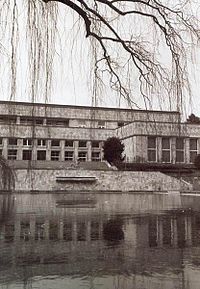 Behind the rotunda is an oblong pool with a Nymphenskulptur (German:Nymph sculpture) at the water's edge created by Fritz Klimsch entitled "Am Wasser". Behind it stands a flat building on a hill with a terrace—the casino of IG Farben, which now houses a refectory and lecture-rooms.