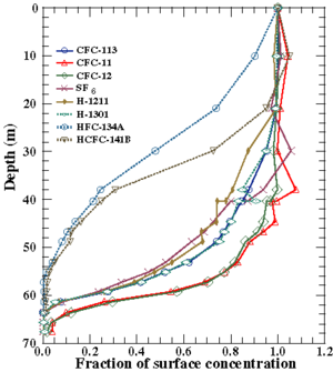 At the South Pole, the firn-ice transition depth is at 122 m, with a CO2 age of about 100 years. Gases involved in ozone depletion, CFCs, chlorocarbons, and bromocarbons, were measured in firn and levels were almost zero at around 1880 except for CH3Br, which is known to have natural sources. Similar study of Greenland firn found that CFCs vanished at a depth of 69 m (CO2 age of 1929).