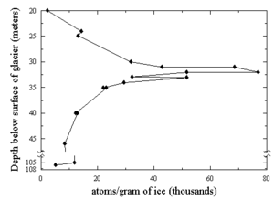 Analysis of the Upper Fremont Glacier ice core showed large levels of chlorine-36 that definitely correspond to the production of that isotope during atmospheric testing of nuclear weapons. This result is interesting because the signal exists despite being on a glacier and undergoing the effects of thawing, refreezing, and associated meltwater percolation. 36Cl has also been detected in the Dye-3 ice core (Greenland) , and in firn at Vostok.