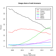 Internet Explorer is one of the most widely used web browsers, attaining a peak of about 95% usage share during 2002 and 2003. Its usage share has since declined with the launch of Safari (2003), Firefox (2004), and Google Chrome (2008), each of which now has significant market share. Estimates for Internet Explorer's overall market share range from 27.4% to 54.13%, as of October 2012 (browser market share is notoriously difficult to calculate). Microsoft spent over US$100 million per year on Internet Explorer in the late 1990s, with over 1000 people working on it by 1999.
